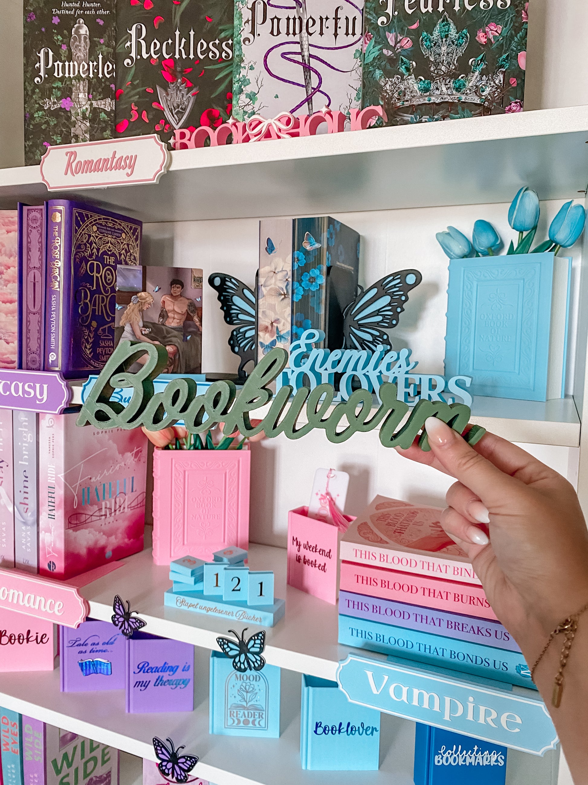 Ob in zartem Rosa, elegantem Schwarz oder auffälligem Lila – diese Schriftaufsteller setzen deine Bücherliebe perfekt in Szene!